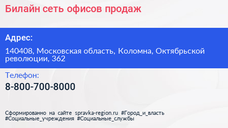 Билайн, сеть офисов продаж по адресу 140408, Московская область, Коломна, Октябрьской революции, 362 в дальнейшем Организация, размещена в следующих категориях: