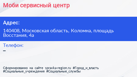 Моби, сервисный центр по адресу 140408, Московская область, Коломна, площадь Восстания, 4а в дальнейшем Организация, размещена в следующих категориях: