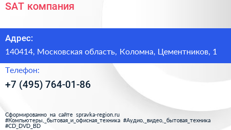 SAT, компания по адресу 140414, Московская область, Коломна, Цементников, 1 в дальнейшем Организация, размещена в следующих категориях:
