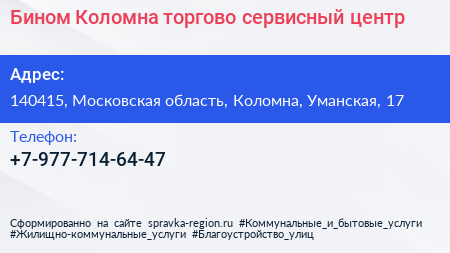 Бином-Коломна, торгово-сервисный центр по адресу 140415, Московская область, Коломна, Уманская, 17 в дальнейшем Организация, размещена в следующих категориях: