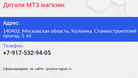 Детали МТЗ, магазин по адресу 140402, Московская область, Коломна, Станкостроителей проезд, 5 к6 в дальнейшем Организация, размещена в следующих категориях: