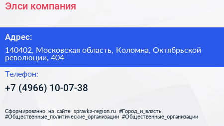 Элси, компания по адресу 140402, Московская область, Коломна, Октябрьской революции, 404 в дальнейшем Организация, размещена в следующих категориях: