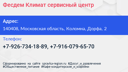 Фесдем Климат, сервисный центр по адресу 140408, Московская область, Коломна, Дорфа, 2 в дальнейшем Организация, размещена в следующих категориях: