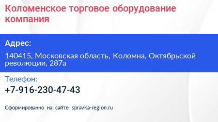 Коломенское торговое оборудование, компания по адресу 140415, Московская область, Коломна, Октябрьской революции, 287а в дальнейшем Организация, размещена в следующих категориях: