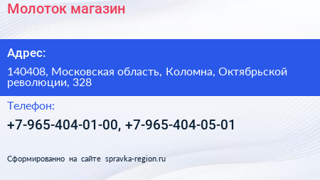 Молоток, магазин по адресу 140408, Московская область, Коломна, Октябрьской революции, 328 в дальнейшем Организация, размещена в следующих категориях: