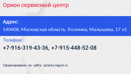 Орион, сервисный центр по адресу 140408, Московская область, Коломна, Малышева, 17 к1 в дальнейшем Организация, размещена в следующих категориях: