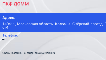 ПКФ ДОММ по адресу 140411, Московская область, Коломна, Озёрский проезд, 3 ст4 в дальнейшем Организация, размещена в следующих категориях: