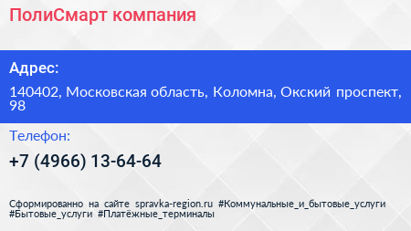ПолиСмарт, компания по адресу 140402, Московская область, Коломна, Окский проспект, 98 в дальнейшем Организация, размещена в следующих категориях: