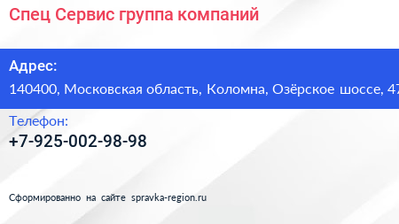 Спец-Сервис, группа компаний по адресу 140400, Московская область, Коломна, Озёрское шоссе, 47 в дальнейшем Организация, размещена в следующих категориях: