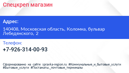 Спецкреп, магазин по адресу 140408, Московская область, Коломна, бульвар Лебедянского, 2 в дальнейшем Организация, размещена в следующих категориях: