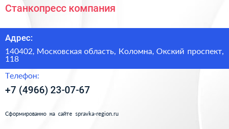Станкопресс, компания по адресу 140402, Московская область, Коломна, Окский проспект, 118 в дальнейшем Организация, размещена в следующих категориях: