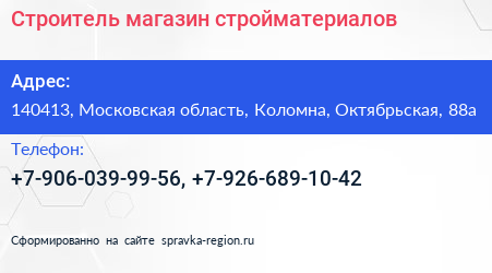 Строитель, магазин стройматериалов по адресу 140413, Московская область, Коломна, Октябрьская, 88а в дальнейшем Организация, размещена в следующих категориях: