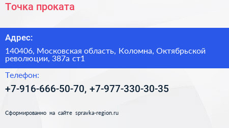 Точка проката по адресу 140406, Московская область, Коломна, Октябрьской революции, 387а ст1 в дальнейшем Организация, размещена в следующих категориях: