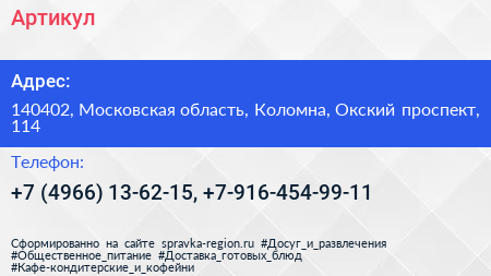 Артикул по адресу 140402, Московская область, Коломна, Окский проспект, 114 в дальнейшем Организация, размещена в следующих категориях: