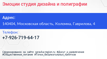 Эмоции, студия дизайна и полиграфии по адресу 140404, Московская область, Коломна, Гаврилова, 4 в дальнейшем Организация, размещена в следующих категориях: