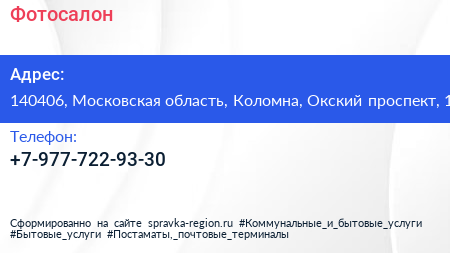 Фотосалон по адресу 140406, Московская область, Коломна, Окский проспект, 1 в дальнейшем Организация, размещена в следующих категориях: