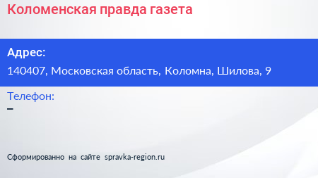Коломенская правда, газета по адресу 140407, Московская область, Коломна, Шилова, 9 в дальнейшем Организация, размещена в следующих категориях: