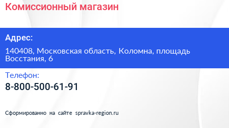Комиссионный магазин по адресу 140408, Московская область, Коломна, площадь Восстания, 6 в дальнейшем Организация, размещена в следующих категориях: