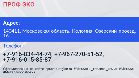 ПРОФ-ЭКО по адресу 140411, Московская область, Коломна, Озёрский проезд, 16 в дальнейшем Организация, размещена в следующих категориях: