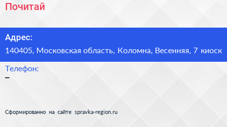 Почитай по адресу 140405, Московская область, Коломна, Весенняя, 7 киоск в дальнейшем Организация, размещена в следующих категориях: