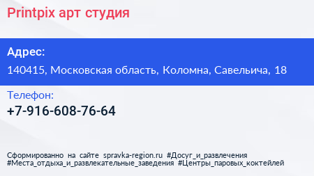 Printpix, арт-студия по адресу 140415, Московская область, Коломна, Савельича, 18 в дальнейшем Организация, размещена в следующих категориях: