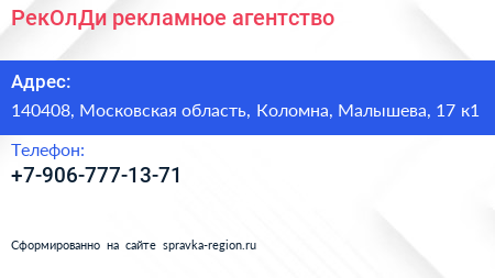РекОлДи, рекламное агентство по адресу 140408, Московская область, Коломна, Малышева, 17 к1 в дальнейшем Организация, размещена в следующих категориях: