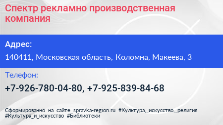 Спектр, рекламно-производственная компания по адресу 140411, Московская область, Коломна, Макеева, 3 в дальнейшем Организация, размещена в следующих категориях: