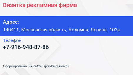 Визитка, рекламная фирма по адресу 140411, Московская область, Коломна, Ленина, 103а в дальнейшем Организация, размещена в следующих категориях: