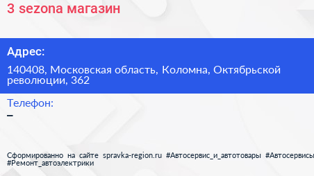 3 sezona, магазин по адресу 140408, Московская область, Коломна, Октябрьской революции, 362 в дальнейшем Организация, размещена в следующих категориях: