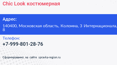 Chic Look, костюмерная по адресу 140400, Московская область, Коломна, 3 Интернационала, 8 в дальнейшем Организация, размещена в следующих категориях: