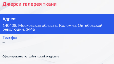 Джерси, галерея ткани по адресу 140408, Московская область, Коломна, Октябрьской революции, 344Б в дальнейшем Организация, размещена в следующих категориях: