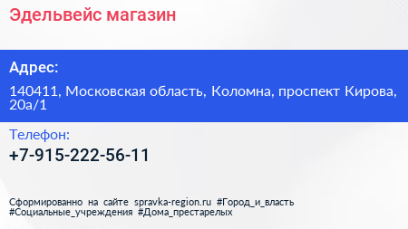 Эдельвейс, магазин по адресу 140411, Московская область, Коломна, проспект Кирова, 20а/1 в дальнейшем Организация, размещена в следующих категориях:
