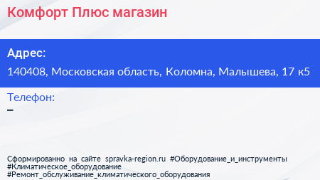 Комфорт Плюс, магазин по адресу 140408, Московская область, Коломна, Малышева, 17 к5 в дальнейшем Организация, размещена в следующих категориях: