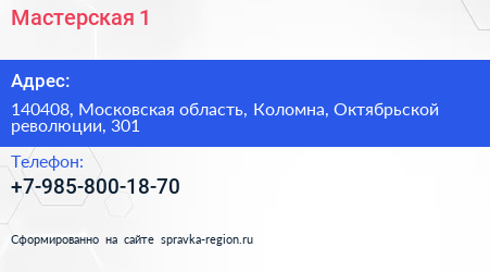 Мастерская №1 по адресу 140408, Московская область, Коломна, Октябрьской революции, 301 в дальнейшем Организация, размещена в следующих категориях: