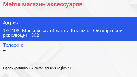 Matrix, магазин аксессуаров по адресу 140408, Московская область, Коломна, Октябрьской революции, 362 в дальнейшем Организация, размещена в следующих категориях: