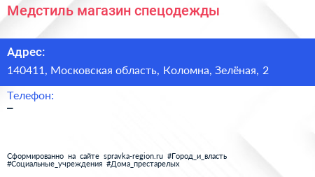 Медстиль, магазин спецодежды по адресу 140411, Московская область, Коломна, Зелёная, 2 в дальнейшем Организация, размещена в следующих категориях:
