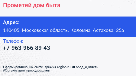 Прометей, дом быта по адресу 140405, Московская область, Коломна, Астахова, 25а в дальнейшем Организация, размещена в следующих категориях: