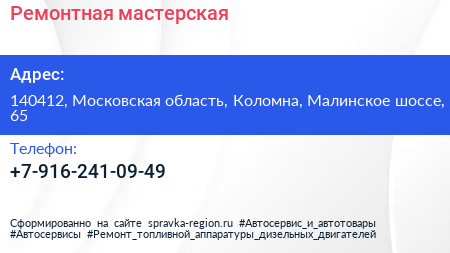 Ремонтная мастерская по адресу 140412, Московская область, Коломна, Малинское шоссе, 65 в дальнейшем Организация, размещена в следующих категориях: