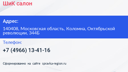 ШиК, салон по адресу 140408, Московская область, Коломна, Октябрьской революции, 344Б в дальнейшем Организация, размещена в следующих категориях: