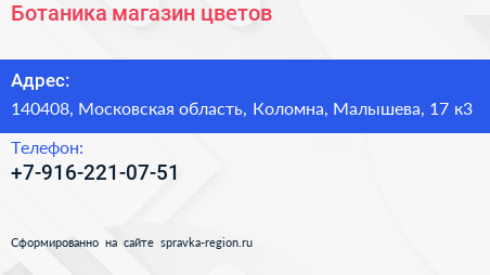 Ботаника, магазин цветов по адресу 140408, Московская область, Коломна, Малышева, 17 к3 в дальнейшем Организация, размещена в следующих категориях: