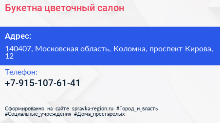 Букетна, цветочный салон по адресу 140407, Московская область, Коломна, проспект Кирова, 12 в дальнейшем Организация, размещена в следующих категориях: