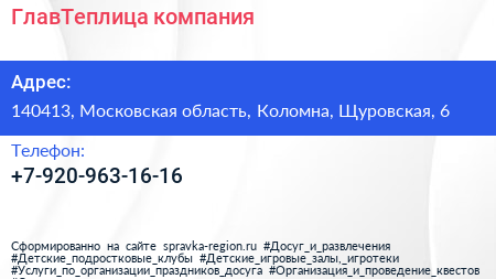 ГлавТеплица, компания по адресу 140413, Московская область, Коломна, Щуровская, 6 в дальнейшем Организация, размещена в следующих категориях: