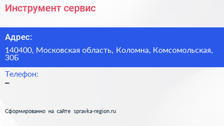 Инструмент-сервис по адресу 140400, Московская область, Коломна, Комсомольская, 30Б в дальнейшем Организация, размещена в следующих категориях: