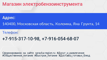 Магазин электробензоинструмента по адресу 140400, Московская область, Коломна, Яна Грунта, 14 в дальнейшем Организация, размещена в следующих категориях: