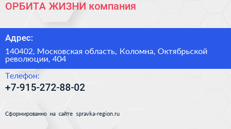 ОРБИТА ЖИЗНИ, компания по адресу 140402, Московская область, Коломна, Октябрьской революции, 404 в дальнейшем Организация, размещена в следующих категориях: