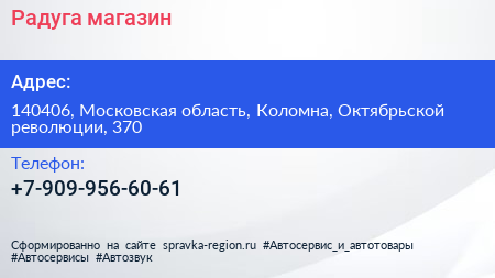Радуга, магазин по адресу 140406, Московская область, Коломна, Октябрьской революции, 370 в дальнейшем Организация, размещена в следующих категориях: