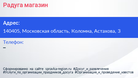 Радуга, магазин по адресу 140405, Московская область, Коломна, Астахова, 3 в дальнейшем Организация, размещена в следующих категориях: