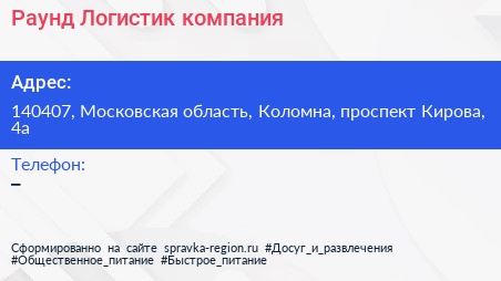 Раунд Логистик, компания по адресу 140407, Московская область, Коломна, проспект Кирова, 4а в дальнейшем Организация, размещена в следующих категориях: