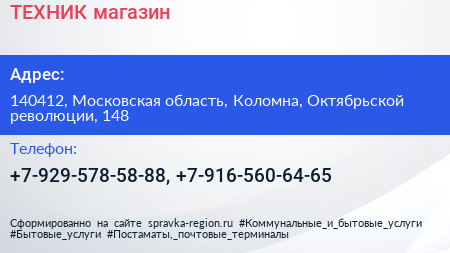 ТЕХНИК, магазин по адресу 140412, Московская область, Коломна, Октябрьской революции, 148 в дальнейшем Организация, размещена в следующих категориях: