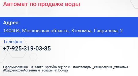 Автомат по продаже воды по адресу 140404, Московская область, Коломна, Гаврилова, 2 в дальнейшем Организация, размещена в следующих категориях: